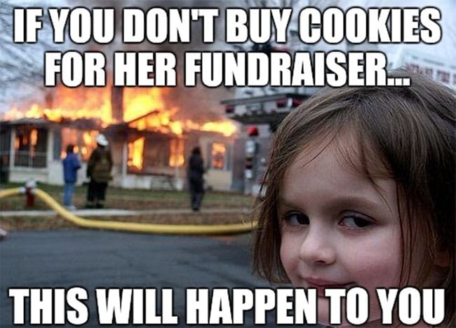 Of course, if sexy doesn’t work, there’s always the threat of arson. People would much rather contribute to your cause than face the wrath of Disaster Girl.